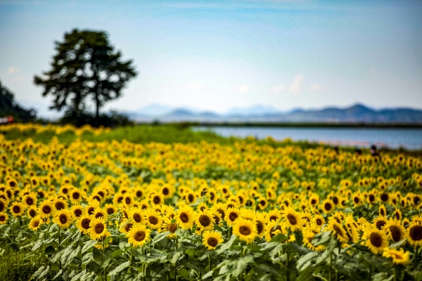 약 3만㎡ 규모의 공유수면에 해바라기가 황금빛 물결처럼 저수지를 따라 끝없이 펼쳐져 장관을 이룬다.
