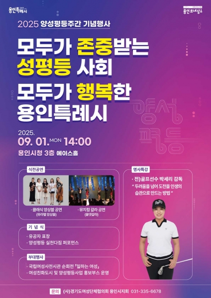 [금요저널] 용인특례시는 9월 1일 오후 2시 시청 3층 에이스홀에서 ‘2025 양성평등주간 기념행사’를 개최한다고 25일 밝혔다.