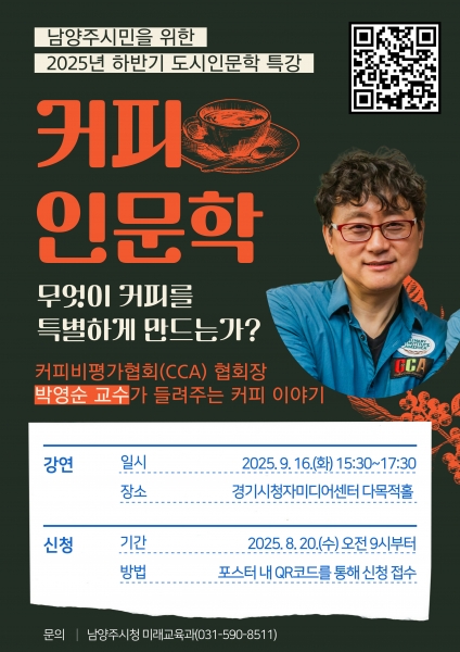 시 관계자는 “이번 특강은 커피라는 일상적인 소재를 통해 인문학의 가치를 쉽고 재미있게 전달하는 자리”며 “많은 시민들이 참여해 새로운 관점과 배움의 즐거움을 발견하길 바란다”고 말했다.