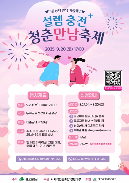 [금요저널] 대구광역시는 오는 9월 20일 오후 5시, 두류공원 2.28자유광장에서 올해 미혼남녀 만남 행사의 대미를 장식할 ‘청춘 만남 축제’를 개최한다.