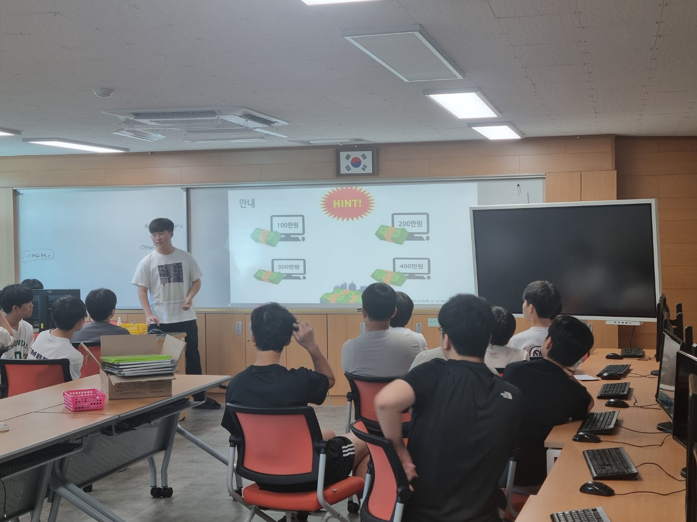 Excel 코딩을 통한 주식 시뮬레이션 프로그램을 제작하였고 조원들과 협력하여 최고의 수익률을 성취할 수 있는 협동하는 프로그램을 운영하였다. 또한 쿠팡플레이 ‘대학전쟁’에서 아이디어를 얻어 직접 문제를 제작하여 전자두뇌, 소수체크, 300, 미스터리 사인 주제로 지식 두뇌전쟁 프로그램을 운영하였다.