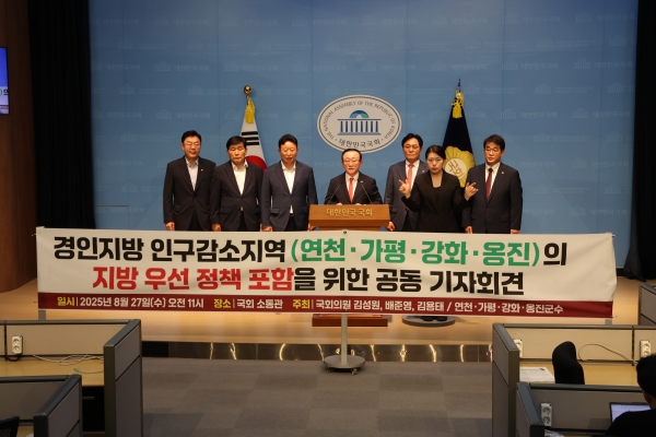 [금요저널] 경기 연천군, 가평군, 인천 강화군, 옹진군 4개 기초자치단체는 27일 국회 소통관에서 기자회견을 열고 정부가 균형성장을 위해 추진하는 지방 우선 정책 분야에 경인지방 인구감소지역을 포함해 달라고 촉구했다.