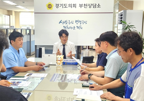 [금요저널] 경기도의회 박상현 의원은 26일 부천상담소에서 부천시 오정구에 건립 예정인 택시복지센터 주변 주차난 해소를 위해 부천시 구점자, 손준기 시의원, 부천시 대중교통과, 주차정책과, 택시화물팀, 주차정택팀 등 실무자들이 머리를 맞댔다.