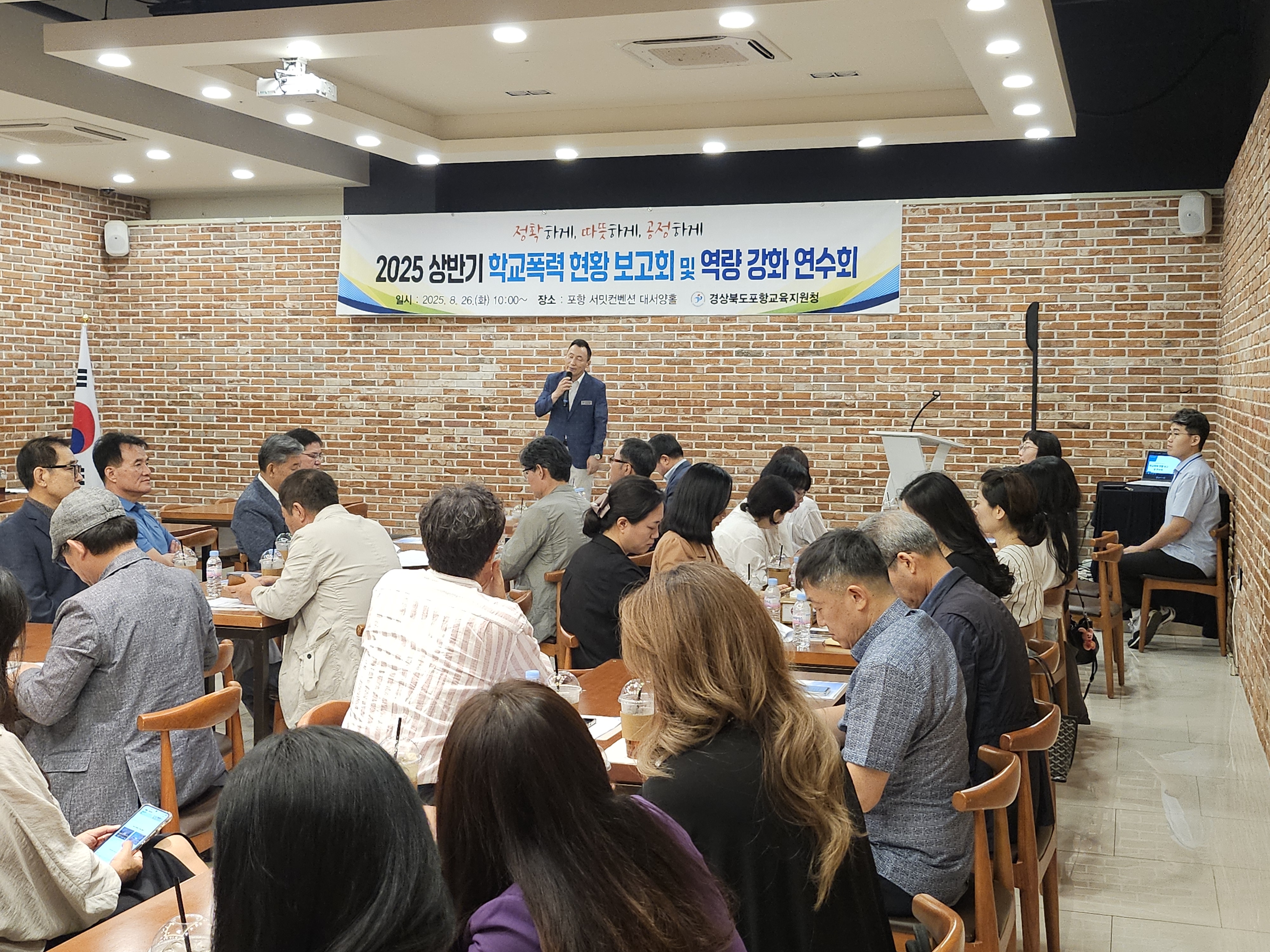 경상북도포항교육지원청(교육장 최한용)은 2025년 8월 26일, 학교폭력전담조사관, 관계개선지원단, 학교폭력대책심의위원을 대상으로 ‘정확하게, 따뜻하게, 공정하게’ 슬로건에 맞춰 학교폭력 현황 보고회 및 역량 강화 연수를 개최하였다.