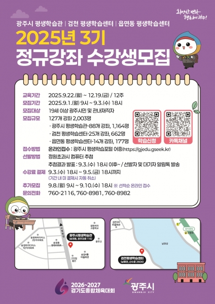 [금요저널] 광주시는 오는 9월 1일부터 3일까지 광주시 평생학습관과 검천 평생학습센터 제3기 프로그램, 그리고 읍·면·동 평생학습센터 하반기 프로그램의 수강생을 모집한다.