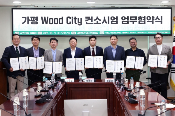가평군은 27일 국회에서 김용태 의원, 국립산림과학원, 서울대학교 산림과학부 등과 함께 ‘가평 우드시티 컨소시엄’ 업무협약을 체결했다.