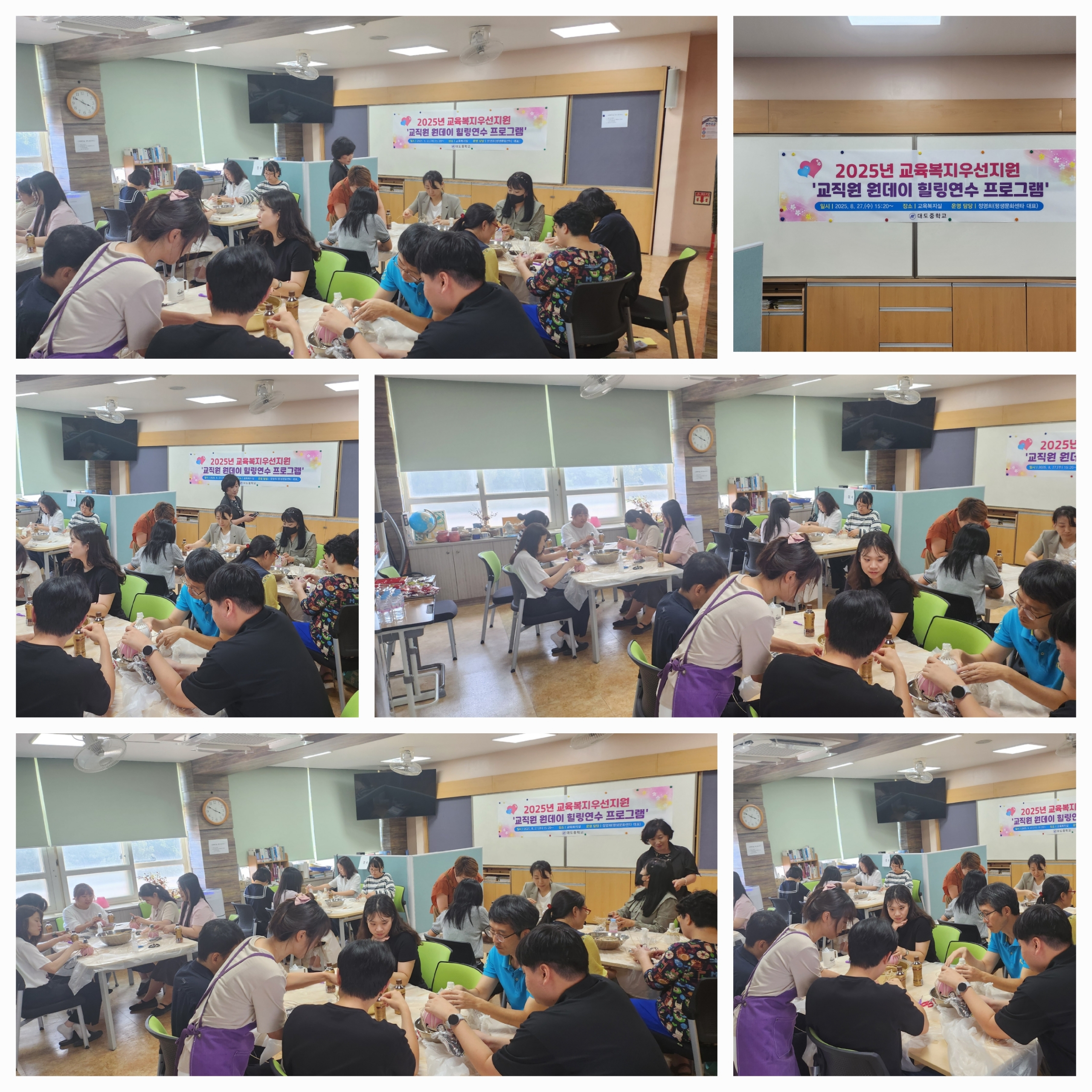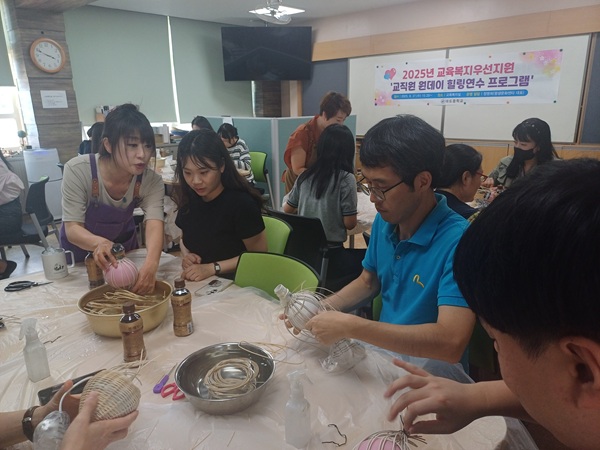 □ 대도중학교(교장 김성태)는 교육복지우선지원사업의 일환으로 학생들과의 새로운 2학기 맞이로 헌신하고 계시는 교사들의 정신적 어려움을 해소하고 지친 교직원의 몸과 마음을 회복하기 위한 힘의 충전으로‘교직원 원데이 힐링 연수’가 8월 27일 방과후에 운영이 되었다.