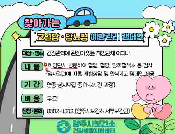 양주시보건소 관계자는“심뇌혈관질환은 이제 고령층 뿐 아니라 생활습관 악화로 인해 젊은 층에서도 발병 가능성이 높아지고 있다”며 “건강할 때부터 자신의 혈관 수치를 확인하고 건강행위를 실천하는 것이 가장 확실한 예방법”이라고 강조했다.