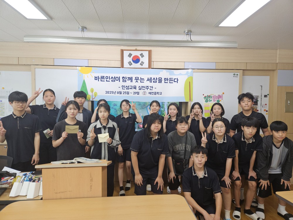 □ 지난 25일부터 29일까지 ‘인성교육실천주간’을 맞아 매전중학교(교장 김기빈)에서 다양한 행사가 진행 되었다. 학생들은 가족 사랑의 날 프로그램을 마련하여 감사 효도 편지 쓰기 등의 다양한 실천 과제들을 수행한 후 인증샷을 남기고, 사제동행 감사와 칭찬 릴레이를 실시하는 등의 다양한 프로그램으로 올바른 품성을 기르고 실천적 인성을 함양하는 뜻깊은 날을 보냈다.
