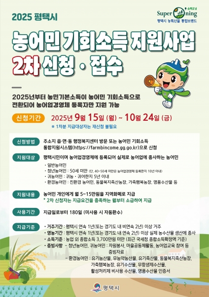 [금요저널] 평택시는 오는 9월 15일부터 10월 24일까지 ‘2025년 농어민 기회소득’ 2차 신청을 접수받는다고 밝혔다.
