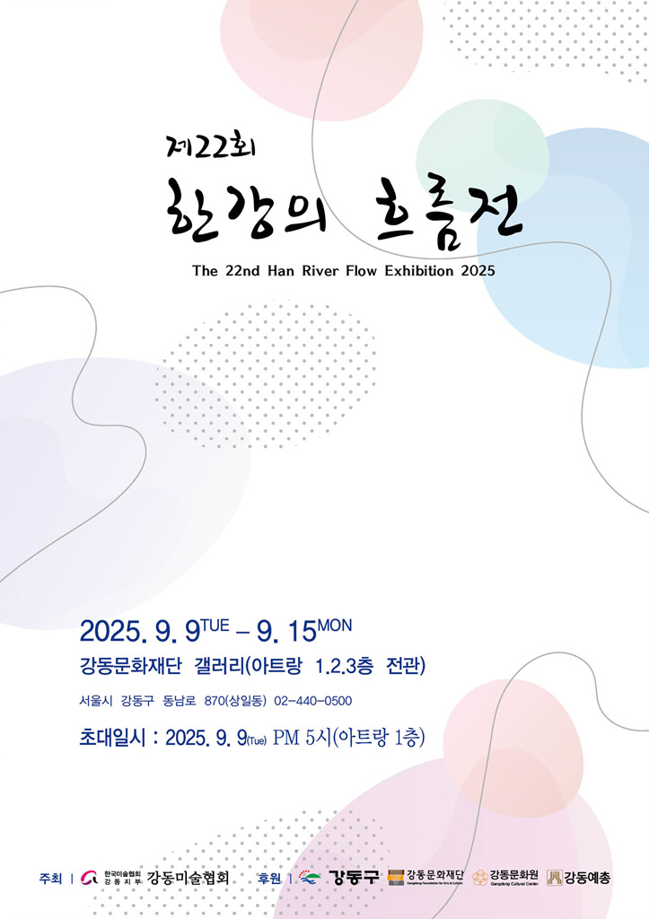 강동미술협회(회장 박장배)가 주최하는 제22회 ‘한강의흐름전’이 오는 9월 9일(화) ~ 9월 15일(월)까지 강동문화재단 갤러리(아트랑)에서 열린다. 이번 전시는 강동미협 회원 정기전이며, 서울시 각 지부와 유명작가가 함께하는 초대전으로 지역주민에게 수준 높은 미술작품 감상 기회를 제공하는 강동구 대표 문화예술 행사 중 하나이다.