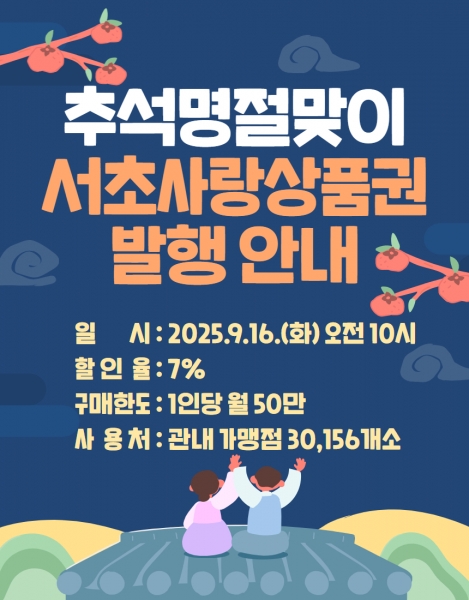 서초구, 추석 맞아 '서초사랑상품권' 7% 특별할인해 100억원 발행