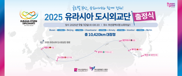 [금요저널] 부산시와 부산글로벌도시재단은 ‘2025 유라시아 도시외교단’ 이 글로벌 허브도시 부산 브랜드를 홍보하고 자매·우호도시와 교류 협력하기 위해 오늘부터 9월 25일까지 총 16일간의 여정을 떠난다고 밝혔다.