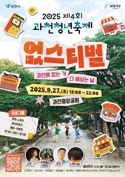 [금요저널] 과천시는 청년의 날을 기념해 오는 27일 중앙공원 일대에서 ‘2025년 제4회 과천청년축제-없스티벌’을 개최한다고 밝혔다.