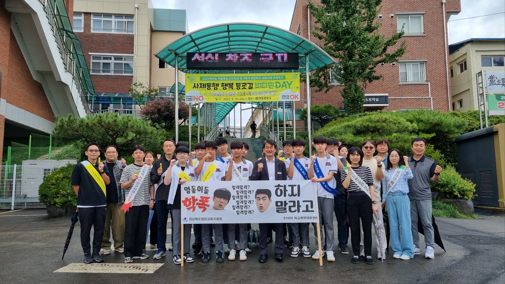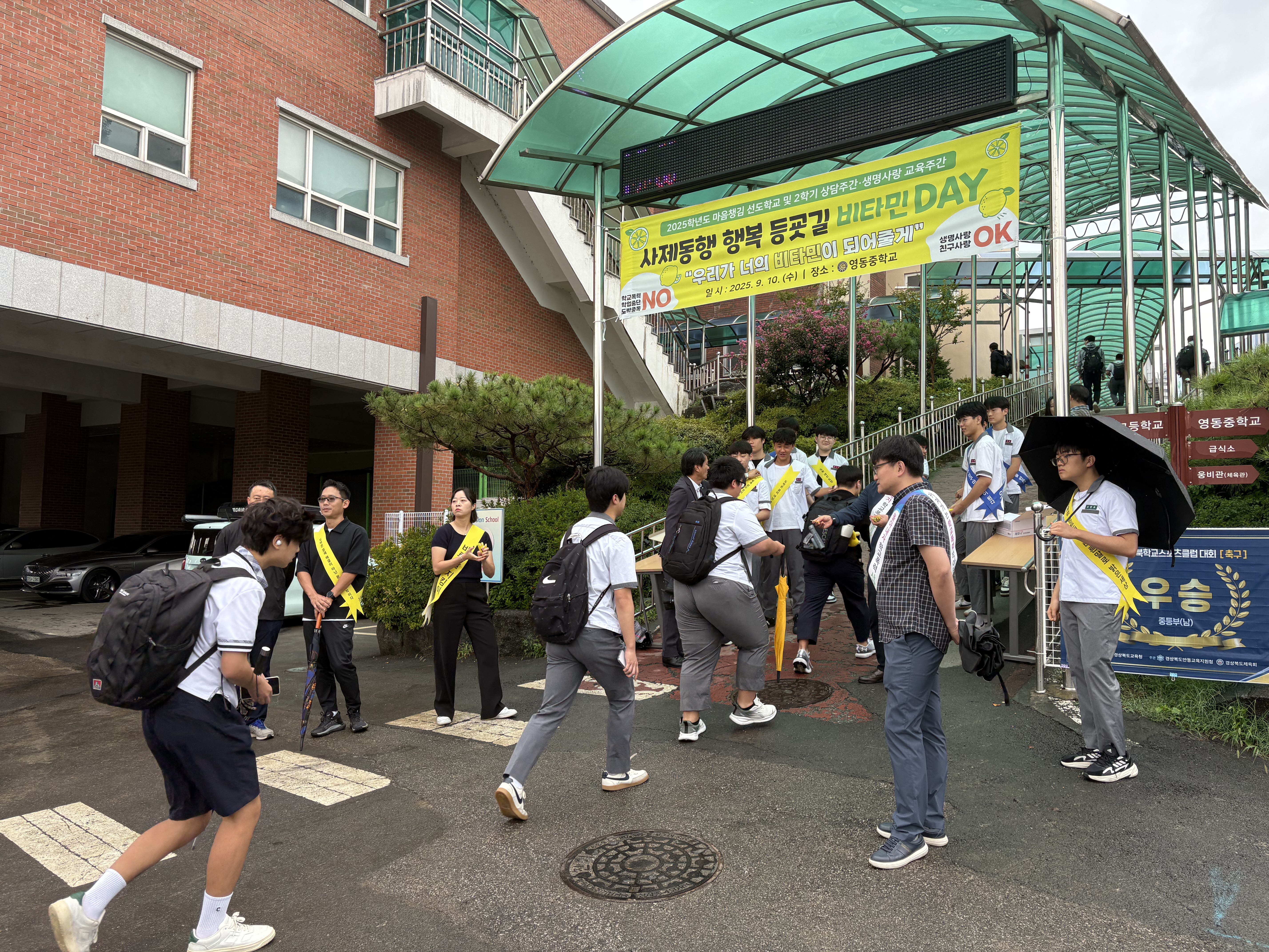 □ 영동중학교(교장 안명환)는 올해 교육부 지정 마음챙김 선도학교로 선정되어 학생들의 심리·정서적 성장을 돕기 위한 다양한 프로그램을 운영하고 있다. 그 일환으로 본교는 2025학년도 하반기 학생 상담주간 및 마음건강 특별 살핌의 달을 맞아, 지난 9월 10일(수) 아침 교문 앞에서 사제동행 행복 등굣길 「비타민 데이」를 실시하였다.