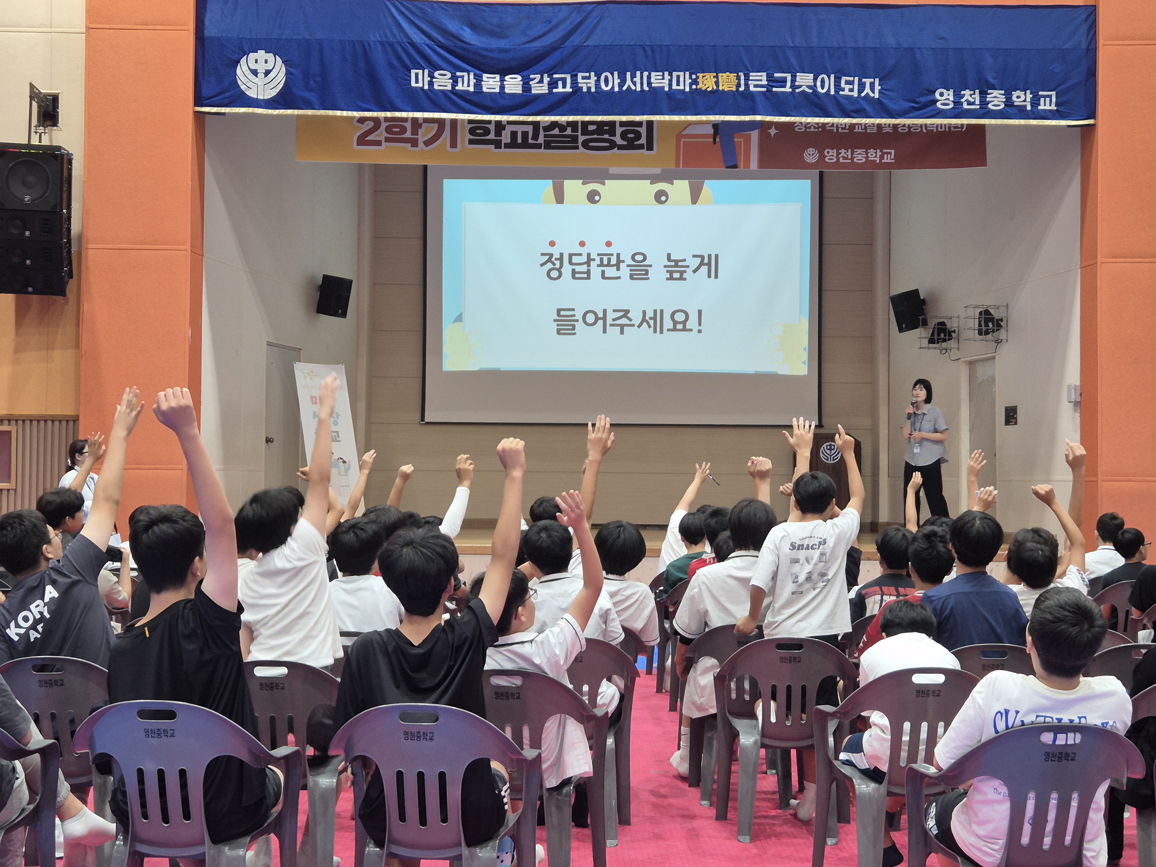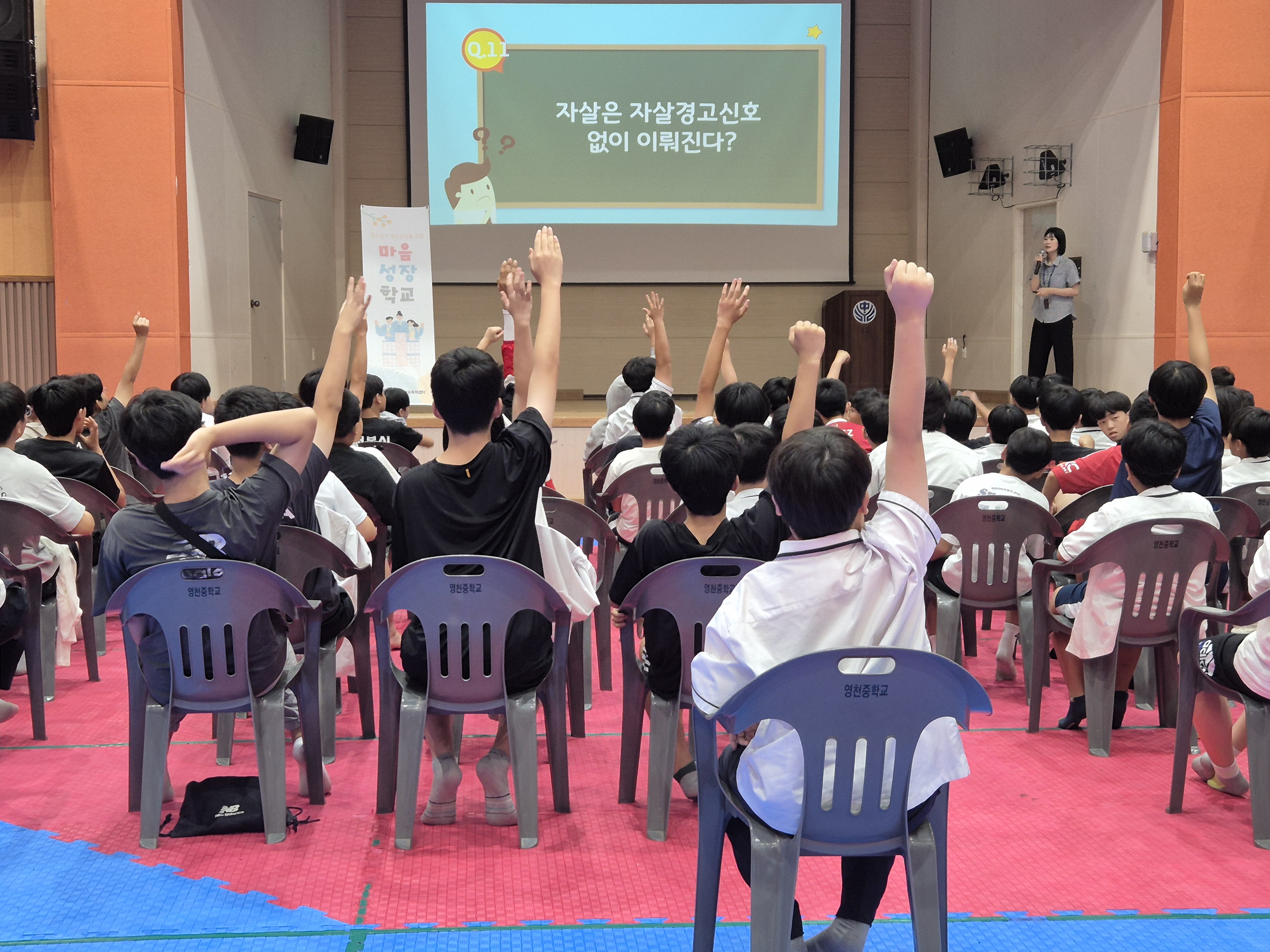 □ 영천중학교(교장 박철수)는 9월 9일(화) 6교시, 본교 강당에서 1학년 학생들을 대상으로 ‘마음성장 퀴즈대회’를 개최했다. 이번 행사는 영천시정신건강복지센터 마음성장학교 담당자의 진행 아래 이루어졌으며, 정신건강과 생명존중을 주제로 한 자살예방 교육의 심화활동으로 마련되었다.