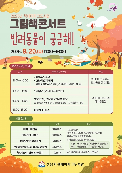 [금요저널] 성남시는 오는 9월 20일 오전 11시~오후 4시 분당구 율동공원 내 책테마파크도서관에서 ‘반려동물이 궁금해’ 주제로 한 그림책 콘서트를 연다.