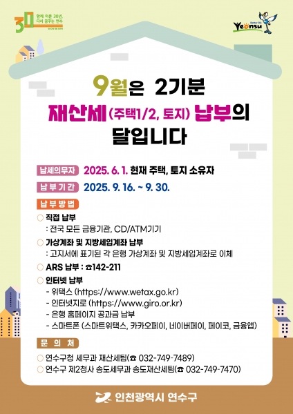 연수구 관계자는 “재산세는 연수구의 복지와 지역 발전을 위한 소중한 재원”이라며 “기한이 지나면 납부지연가산세를 추가로 내야 하는 불이익이 있으니 기한 내 납부해 주시길 바란다”고 말했다.