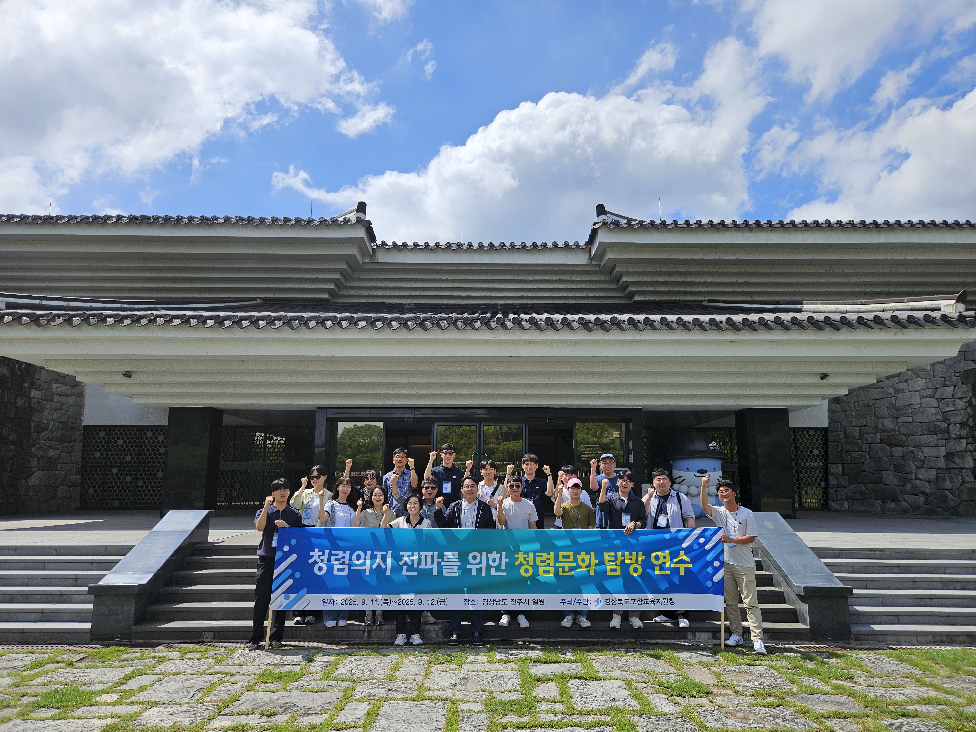 □ 포항교육지원청(교육장 최한용)은 지난 9월 11일(목)부터 12일(금)까지 1박 2일간 경남 진주 일원에서 ‘청렴의지 전파를 위한 청렴문화 탐방 연수’를 실시하였다. 이번 연수에는 교육지원청 소속 직원 26명이 참여하여, 현장 체험형 청렴 활동을 통해 청렴의지를 새롭게 다지고 능동적인 청렴 조직문화 확산을 도모하였다.