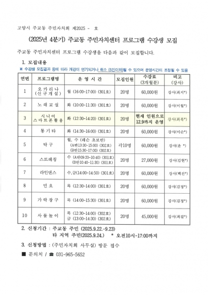 고양시 주교동, 2025년 4분기 주민자치센터 문화강좌 수강생 모집