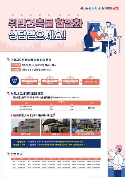 [금요저널] 양천구는 서울시 도시계획조례 개정으로 제2·3종 일반주거지역 용적률이 한시적으로 완화됨에 따라, 건축사가 참여하는 전문 상담센터를 운영해 위반건축물 합법화 절차를 지원한다고 16일 밝혔다.