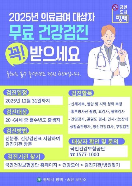 [금요저널] 평택시가 선선한 가을바람과 함께 올 한 해의 건강을 점검할 기회로 의료급여 수급권자의 2025년 일반건강검진 참여를 장려한다.