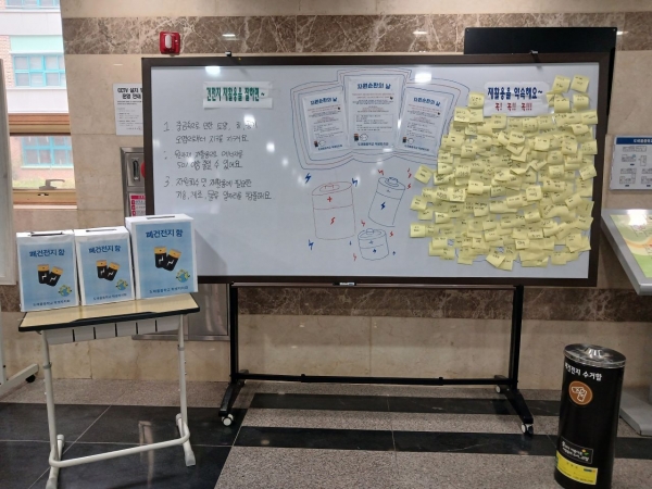 ‘학교와 함께하는 자원순환의 날’은 학생들이 가정에서 모은 폐건전지와 종이팩을 학교로 가져오면, 무게를 측정해 화장지로 교환해주는 사업이다.