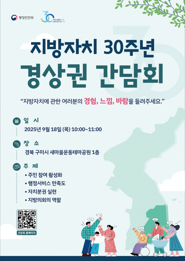 [금요저널] 행정안전부는 9월 18일 경상북도 구미시 새마을운동 테마공원에서 민선 지방자치 30주년을 기념한 ‘제2회 권역별 간담회’를 개최한다고 밝혔다.
