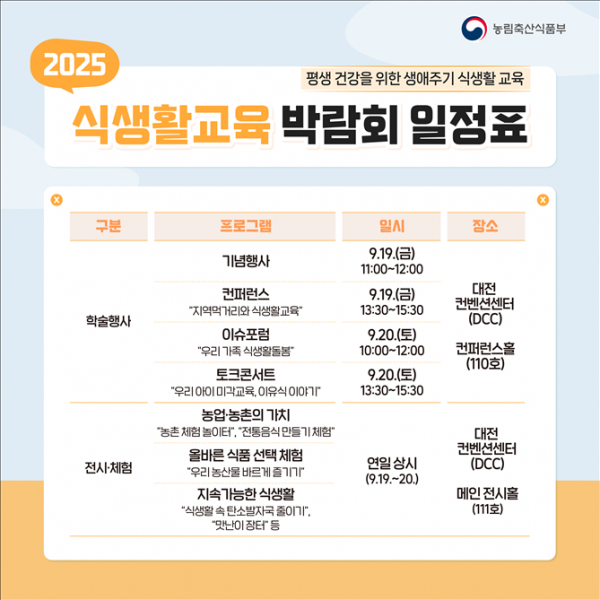[금요저널] 농림축산식품부는 식생활에 대한 국민적 관심을 높이고자 9월 19일부터 20일까지 이틀간 대전컨벤션센터에서 ‘2025 식생활교육 박람회’를 개최한다.