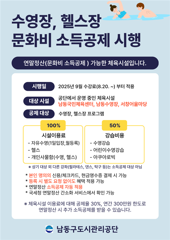 [금요저널] 인천시 남동구 도시관리공단은 공공 체육시설 수영장 및 헬스장 이용료에 대한 문화비 소득공제 혜택을 제공한다고 18일 밝혔다.