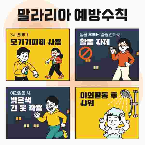 말라리아 예방수칙으로는 △모기기피제 사용 △야간 야외활동 자제 △밝은색의 긴 옷 착용 △야외활동 후 샤워 △가정용 살충제 사용 및 방충망 정비 등이 있다.