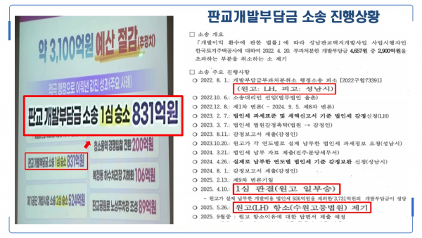 최 의원은 “성남시는 애초 부과한 4,657억원이 아니라 LH가 주장한 2,900억원을 기준으로 삼아 3,731억원이 인정됐다며 이를 831억원 절감 성과로 포장했고 PT 자료에는 ‘1심 승소’라고까지 표기했다”며 “이는 시민 호도를 넘어 조작에 가깝다”고 지적했다.