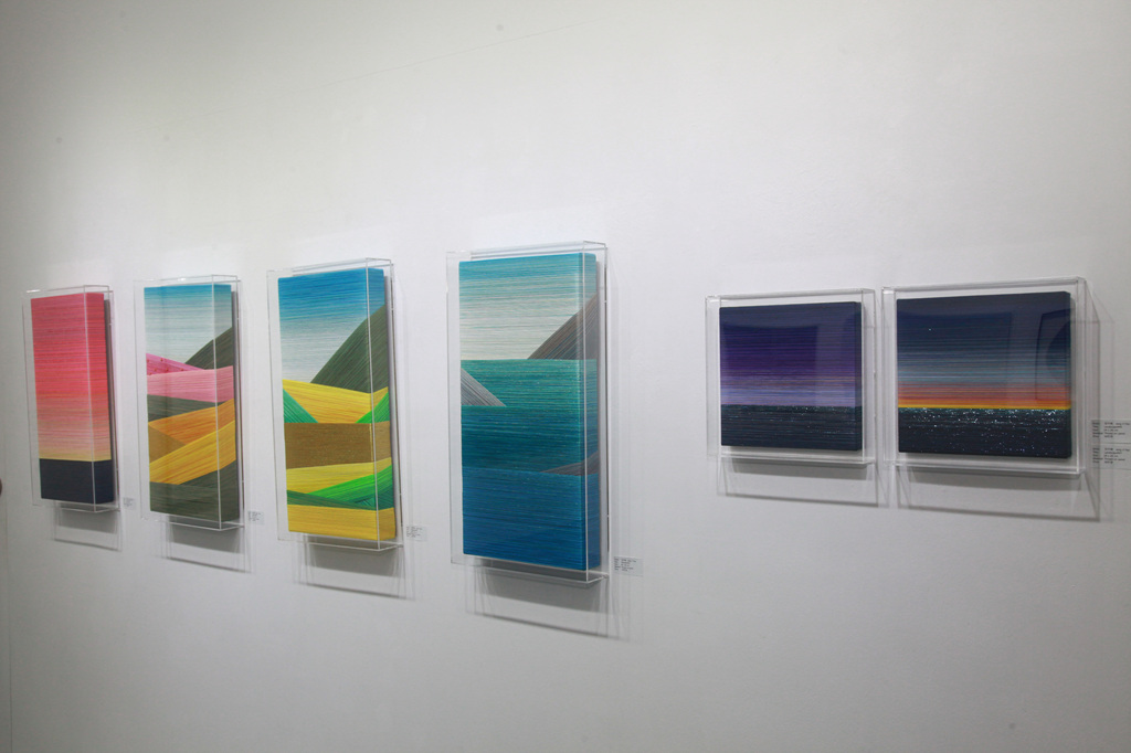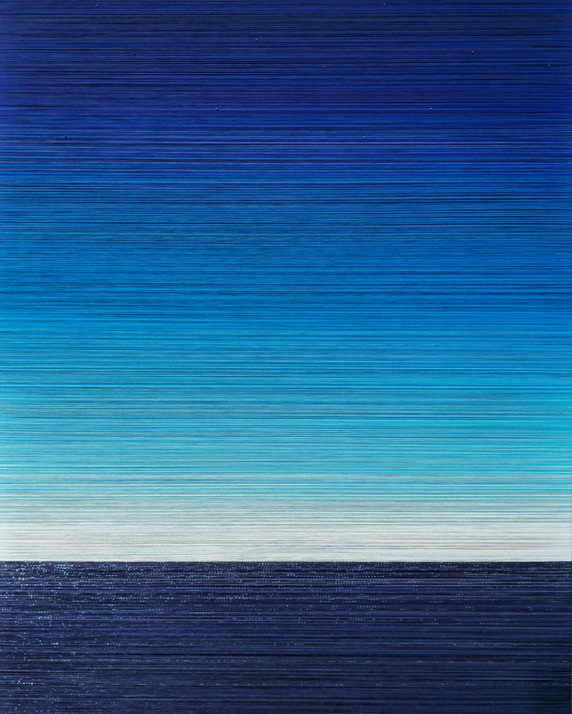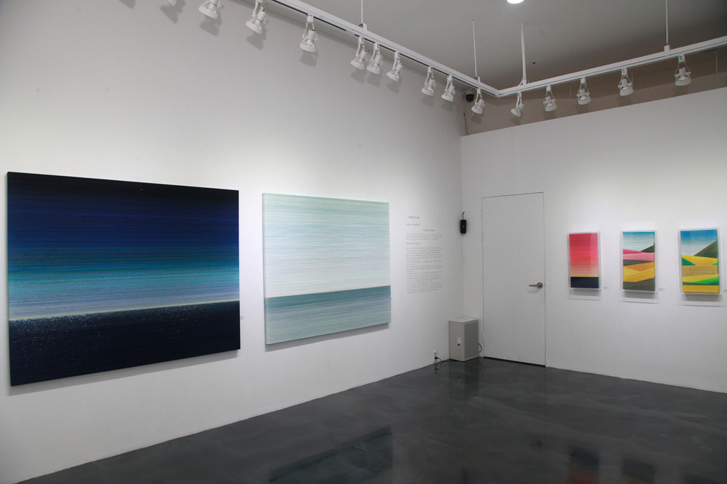반복과 중첩의 과정을 통해 이야기 하고자 하는 주제를 확실하게 표현하여 선명성을 부각 시켰다. 미세한 세필(細筆)과 면의 연동으로 시각과 감각을 확장 시키지만 바탕색을 제외한 모든 재료는 실을 연결한 ‘감성 색과의 조우’이다. 자연에서 추출한 ‘바다와 들판’ 등이 모티브가 되었고, 어느 시간과 만나느냐에 따라 작품의 색 변화가 다양하여 감동을 머금은 시공간의 감성추상으로 이어진다.