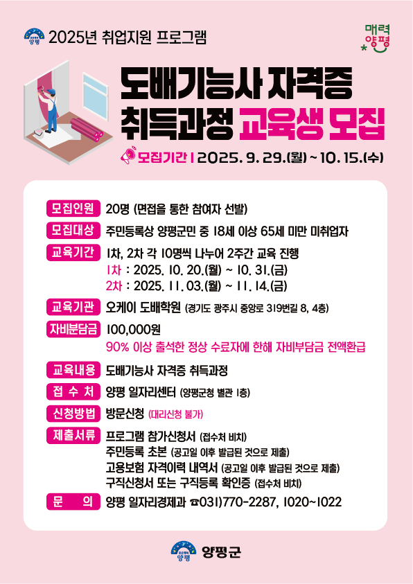 [금요저널] 양평군은 오는 29일부터 인테리어 전문 기술 인재 양성과 지역 일자리 창출을 위해 2025년 취업지원 프로그램 ‘도배기능사 자격증 취득과정’ 교육생을 모집한다고 밝혔다.