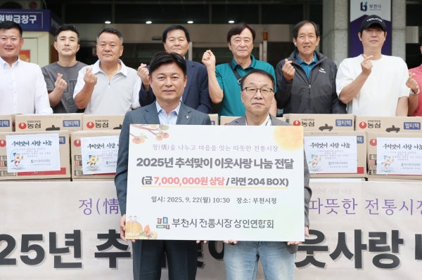 [금요저널] 부천시는 지난 22일 시청에서 부천시전통시장상인연합회와 함께 추석을 맞아 ‘이웃돕기 라면 204박스 전달식’을 가졌다.