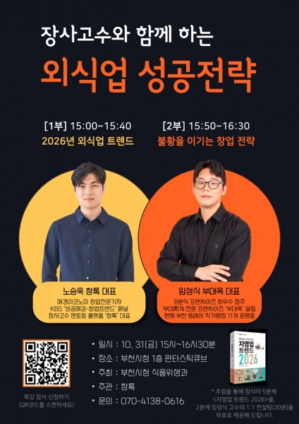 부천시 관계자는 “외식업은 지역경제와 시민 생활에 밀접한 핵심 산업”이라며 “이번 특강이 관내 영업주와 창업 준비자들에게 실질적인 성공전략과 창업 노하우를 제공하는 기회가 되길 바란다”고 말했다.