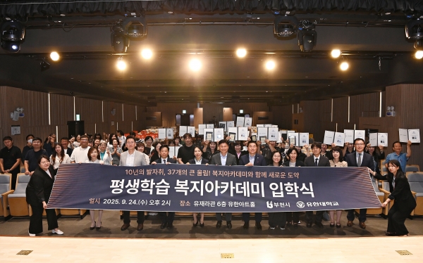행사는 협의체 활동 성과와 복지아카데미 추진 배경 소개로 시작해, 입학생 대표의 입학 선서와 유한대학교 입학에 따른 학생증을 전달하며 학업을 응원하는 순서로 이어졌다.