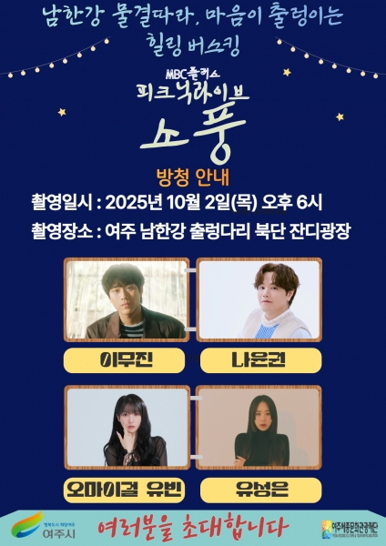 [금요저널] 여주시는 오는 10월 2일 오후 6시에 여주 남한강 출렁다리 북단 잔디광장에서 MBC플러스 음악 프로그램 ‘피크닉 라이브 소풍’ 공연을 진행한다고 밝혔다.