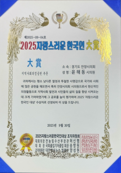[금요저널] 안양시의회 윤해동 의원은 지난 9월 30일 한국프레스센터에서 열린 ‘2025 자랑스러운 한국인 대상’ 시상식에서 지역사회의정공헌 부문 대상을 수상했다.