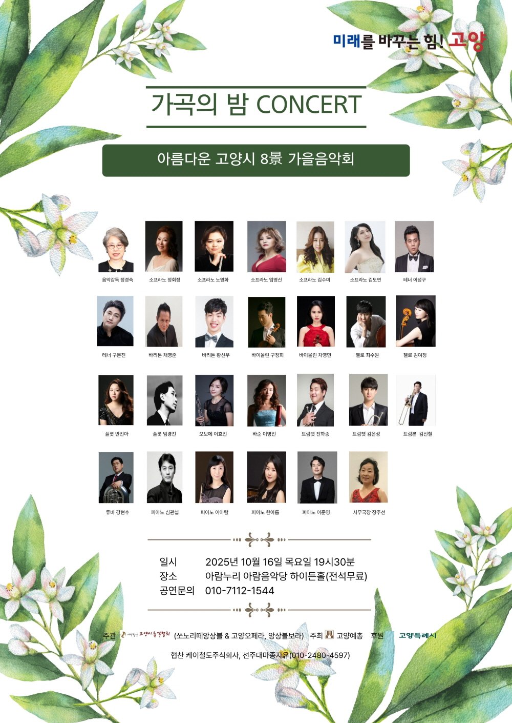 [금요저널] 고양특례시(시장 이동환)가 후원하고 (사)한국예술문화단체총연합회 고양지회가 주최하며 (사)한국음악협회 고양지부(지부장 정경숙)가 주관하는 ‘2025 가곡의 밤 – 아름다운 고양시 8경() 가을 음악회’ 가 오는 16일(목) 오후 7시 30분, 고양아람누리 아람음악당에서 개최된다.