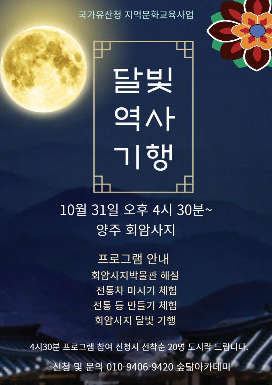 특히 오는 10월 31일 저녁, 회암사지 일원에서 시민 누구나 참여할 수 있는 야간 체험행사 ‘달빛역사기행’ 이 열린다.