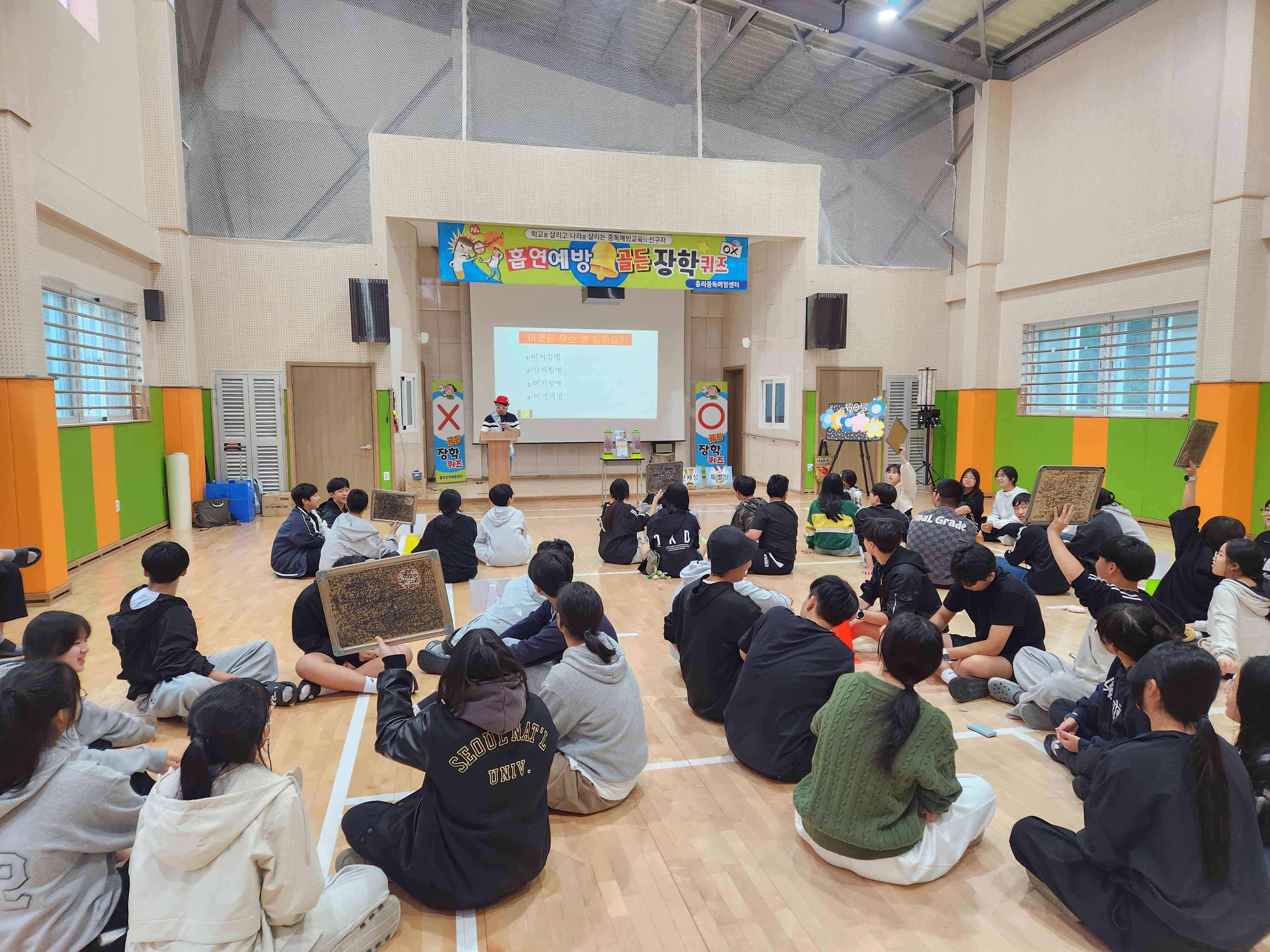 □ 석포중학교(교장 박경환)는 10월 15일(수) 5교시에 전교생을 대상으로 흡연 예방을 위한 ‘노담! 골든장학퀴즈 체험 행사’를 석포중학교 강당(별솔관)에서 실시하였다.