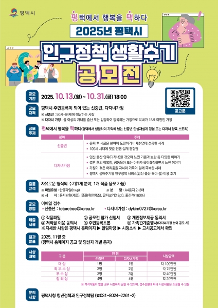 [금요저널] 평택시는 2025년 평택시 인구정책 생활수기 공모전 ‘평택에서 행복을 택하다’를 오는 10월 31일까지 개최한다고 밝혔다.