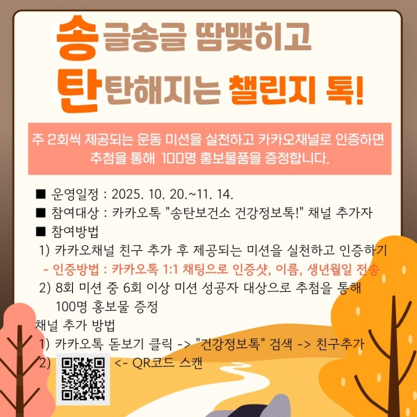 [금요저널] 평택시 송탄보건소는 10월 20일부터 11월 14일까지 카카오톡을 활용한 ‘글송글 땀 맺히고 탄해지는 챌린지 톡’을 운영할 예정이라고 밝혔다.