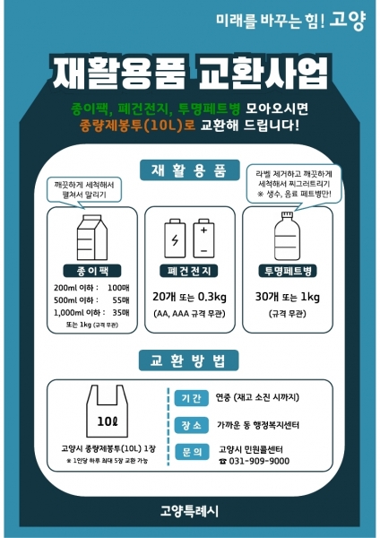 [금요저널] 고양특례시가 2회 추가경정예산을 통해 2천만원을 확보해 시민들의 호응 속에 추진 중인 재활용품 교환사업을 계속 이어간다.