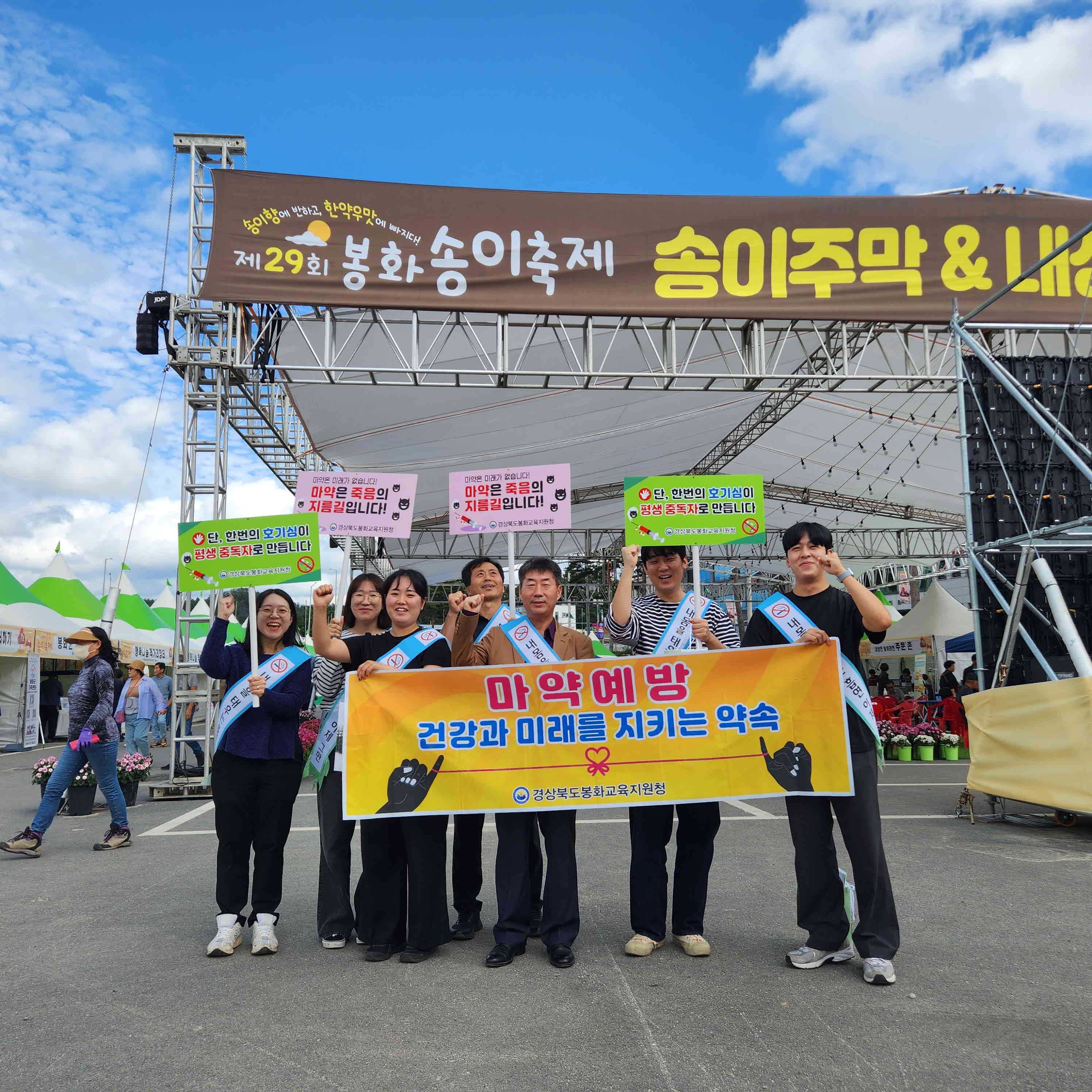 □ 경상북도봉화교육지원청(교육장 이영록)은 2025. 10. 17.(금) 봉화송이축제 현장에서 학생, 학부모 등 지역 주민을 대상으로 흡연 및 마약 등 약물 오남용 예방 캠페인을 실시하였다.