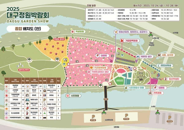 [금요저널] 대구광역시는 일상 속 정원문화를 확산하고 도심 속 녹색 힐링공간을 선보이는 ‘2025 대구정원박람회’를 10월 24일부터 28일까지 5일간 금호강 하중도 일원에서 개최한다.