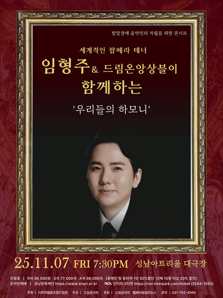 세계적인 팝페라 테너 임형주(로마시립예술대학 성악과 석좌교수)는 장애인과 고령자를 비롯한 사회적 취약계층의 일자리 창출 및 전문적 문화예술 교육 실시하여 직업 예술인으로 성장할 수 있도록 기회를 제공하는 사회적협동조합 드림온과 공동으로 "임형주 & 드림온앙상블이 함께하는 우리들의 하모니" 타이틀로 2025년 11월 7일(금) 19:30 성남아트리움 대극장에서 콘서트를 개최한다.