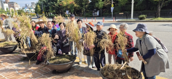 주민자치회는 지난 5월 가와지광장과 왕산공원 일대에 조성한 작은 논 모내기를 시작으로 물대기, 김매기 등 전 과정을 직접 수행해 이번 수확까지 이어왔다.