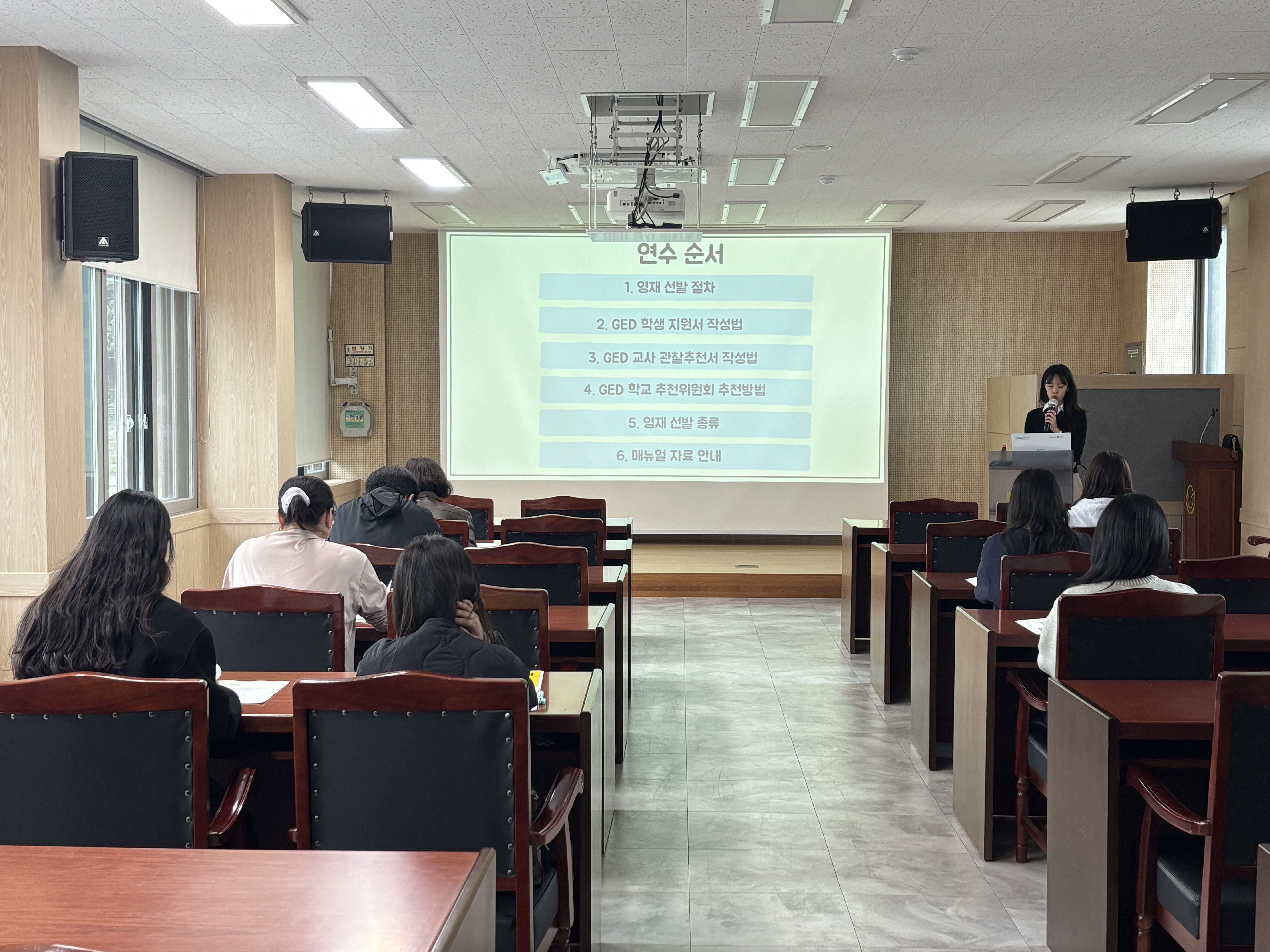 연수는 교사관찰추천제의 전반적인 이해를 바탕으로 관찰 체크리스트 활용법, GED 시스템을 통한 선발 절차 등 실질적인 내용을 중심으로 진행되었다. 이를 통해 교사들이 객관적이고 공정한 선발을 적용할 수 있도록 지원했다.